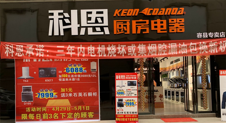 恭賀陳總科恩廚房電器廣西容縣專賣店隆重開業(yè),祝陳總生意興隆,財(cái)源茂盛。我們共創(chuàng)、共贏、共享!