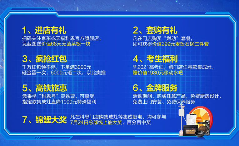 本次科恩“燃動七月”活動媲美“618”、“雙11”促銷優(yōu)惠,7月5日——7月24日活動期間,凡進(jìn)科恩門店或掃碼關(guān)注科恩京東/天貓官方旗艦店,憑截圖就能送價值68元無菌菜板一只。另外,本次集成灶十大品牌、廚電行業(yè)十大品牌科恩集成灶“燃動七月”活動最大的亮點在于“燃動”套餐,爆款產(chǎn)品D115消毒柜款集成灶、D109消毒柜款集成灶、D123X蒸烤消一體變頻大吸力集成灶、D151X蒸烤消一體變頻大吸力集成灶均已加入活動套餐。