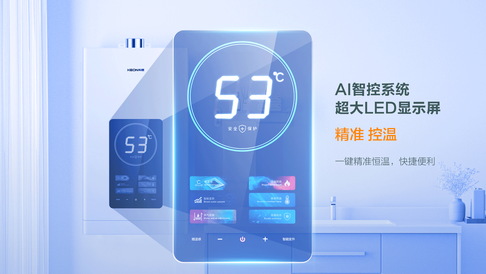 分段燃燒,速熱節能:高精度分段燃燒系統,可根據不同使用要求自動切換,調節范圍更大更精準,夏天出水不燙,冬天出水恒溫舒適,無論春夏秋冬,都能保證用最小的燃氣量到達您最想要的舒適溫度。
