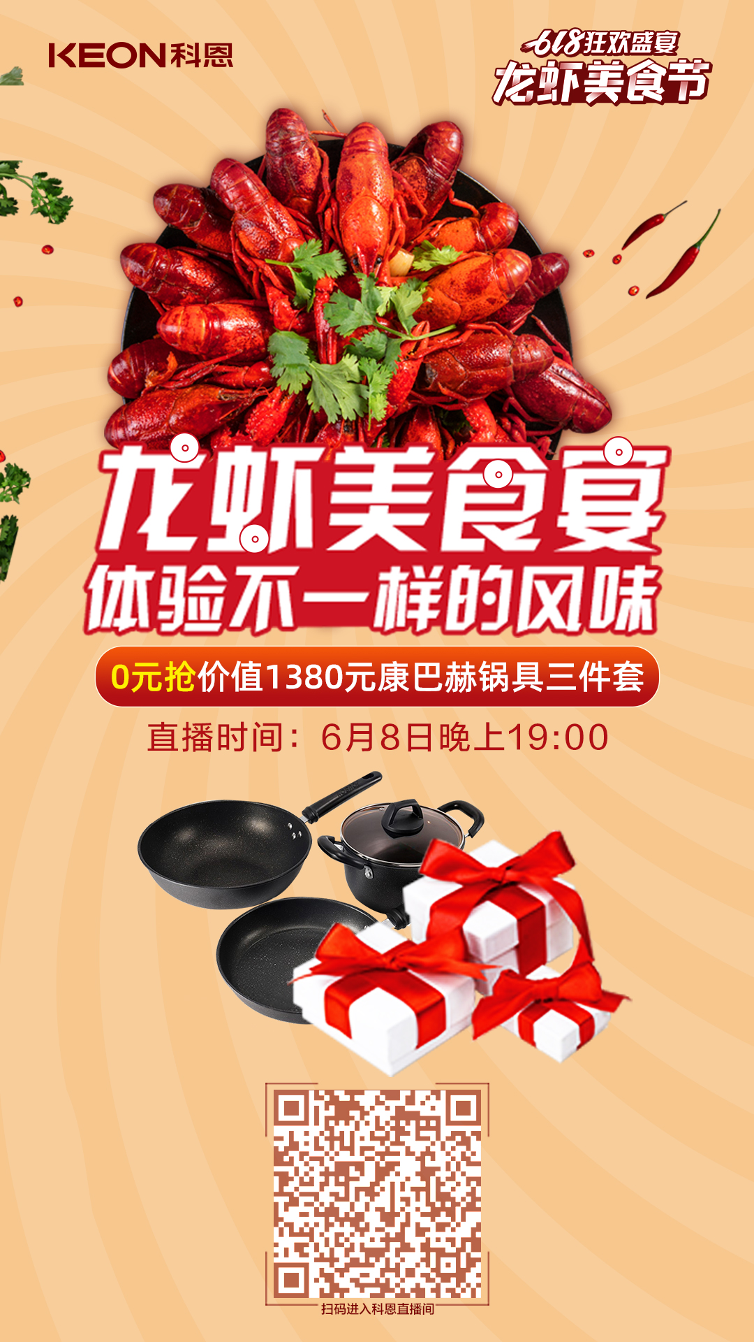 TA來了!TA來了!TA來了!618狂歡盛宴科恩龍蝦美食節——龍蝦美食宴線上直播終于來了,TA帶著傳統和創新的美味來了,TA帶著誠意滿滿的福利來了,6月8日19點,來科恩直播間,我家的科粉,我來寵!!!