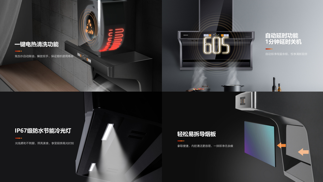 ◆一鍵電熱自清潔功能,自動電加熱溶解油污,高速甩干速凈,免加水自動除油,解放雙手的同時,更能延長煙機的使用壽命、保持大吸力,歷久彌新!
