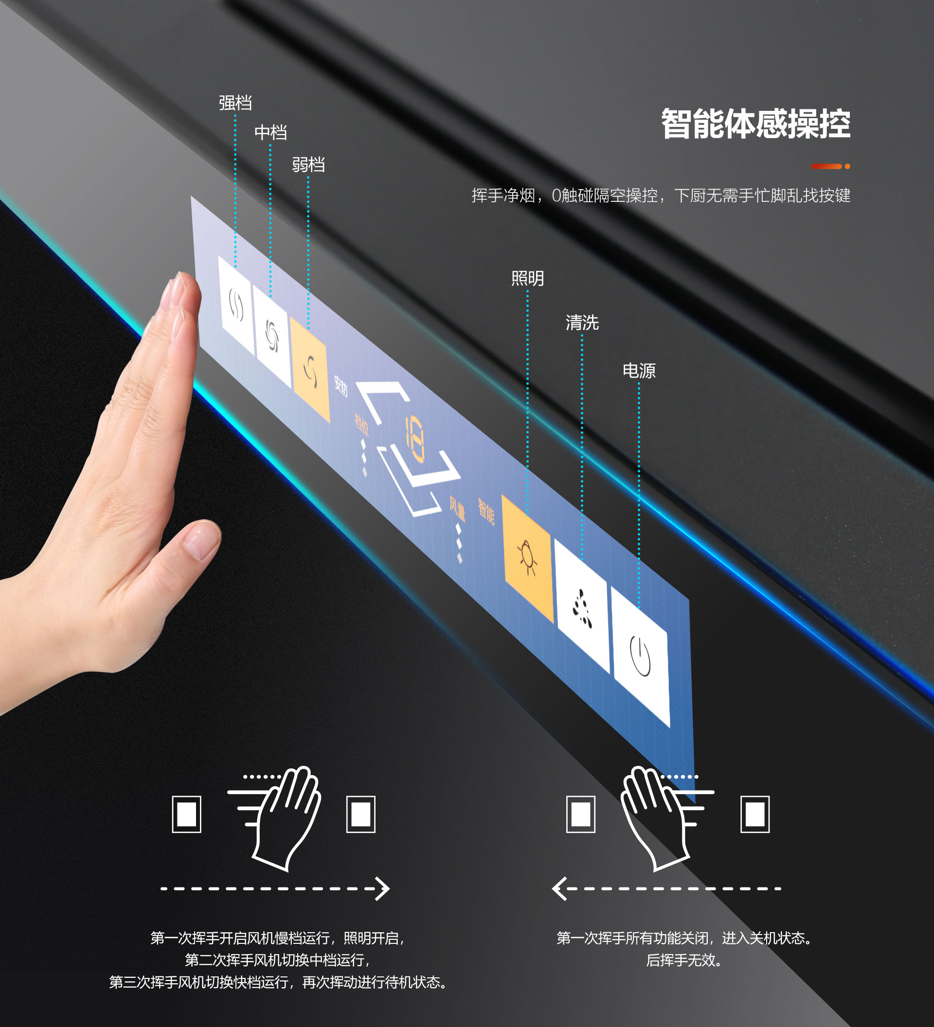 ◆智能體感操控系統,無需觸碰煙機,揮手凈煙,告別繁瑣清潔步驟,更能有效避免手濕油膩導致的觸控不靈敏問題,煙機不留油污、手印,面板時刻干凈免潔!