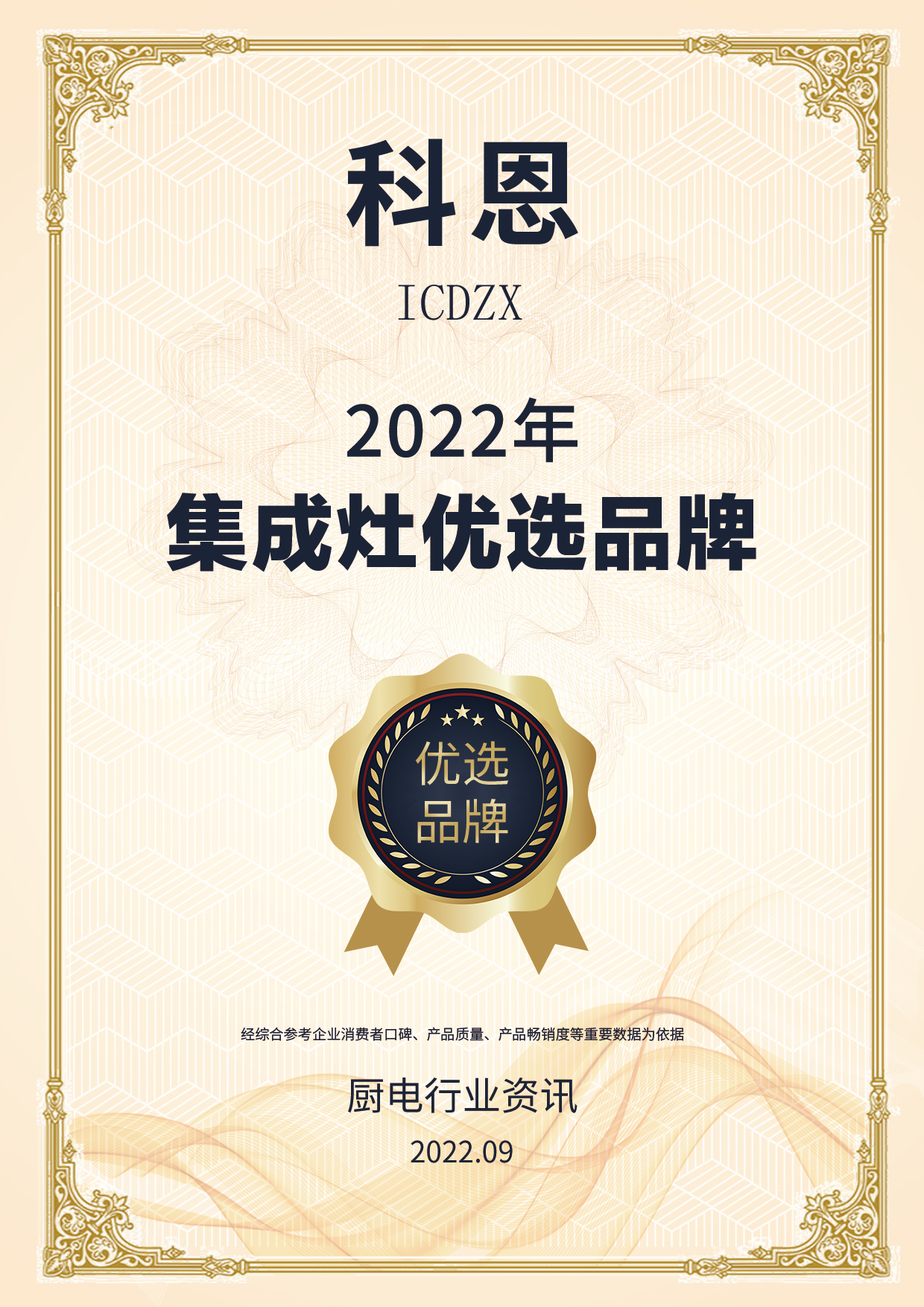 2022年9月作為我國第45個質量月,廚電行業資訊(ID:cdhyzx00809)特舉辦了2022年度質量月之廚電&集成灶優選品牌評比(全國網絡評選),意在為廣大消費者與經銷商篩選出口碑好、產品質量優、售前售后服務到位的品牌。自評比活動啟動以來,經過企業綜合實力篩選、資格初審、后臺評論、留言推薦、數據核對、綜合評審等階段,科恩電器憑借強大的品牌實力、優質的產品性能、領先出色制造工藝在諸多品牌中脫穎而出,斬獲兩大優選品牌雙殊榮!