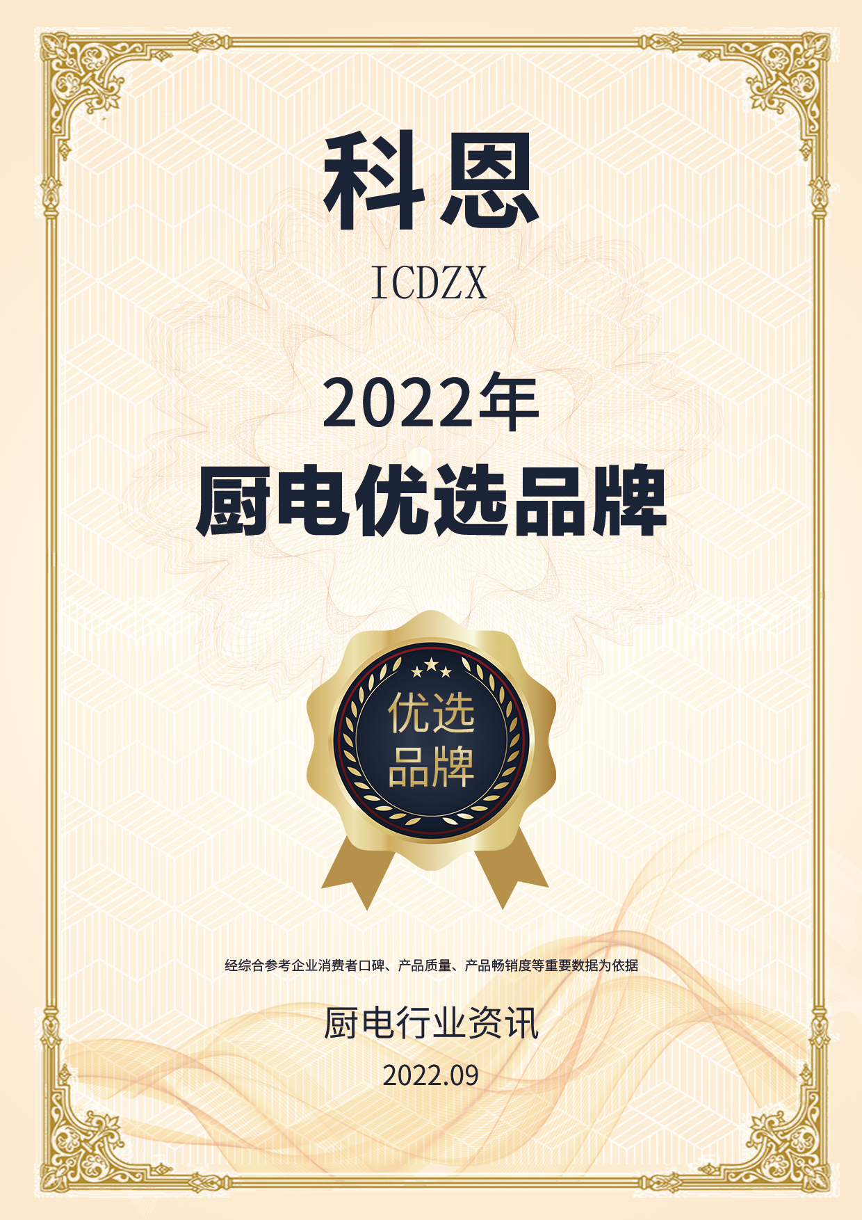 榮登廚電行業資訊『優選品牌』雙殊榮,不僅是對科恩電器產品的認可,更是全國千萬家庭對科恩品牌的認可。以品牌吸引,用產品和服務說話,未來,科恩將一如既往在制造、產品、營銷、服務上扎穩根基,堅守為消費者和經銷商做好一系列服務,不斷創新產品、優化品牌,為更多用戶帶來健康智慧廚房生活。