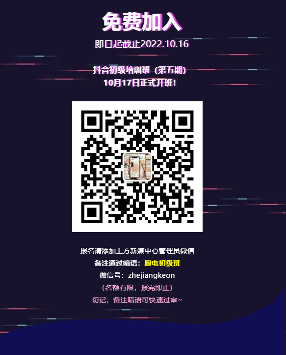 目前,第五期抖音實(shí)戰(zhàn)訓(xùn)練營(yíng)初級(jí)班已全面啟動(dòng),欲報(bào)從速!歡迎在此留言報(bào)名或者添加科恩新媒體官方微信搶占名額!科恩新媒體官方微信:zhejiangkeon