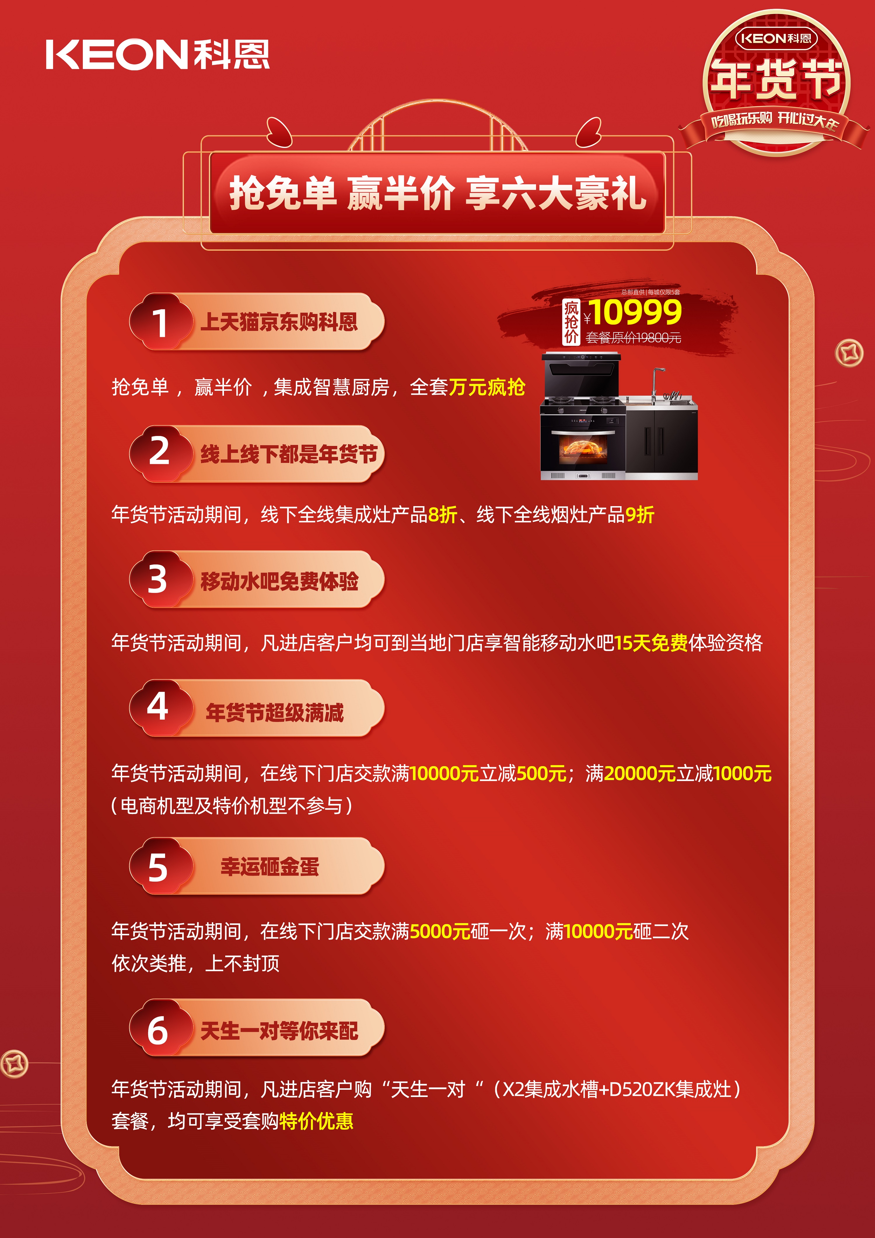 搶免單,贏半價,科恩年貨節萬眾矚目,火熱來襲,吃喝玩樂購,開心過大年!全國聯動,拒絕套路,大額好券,優先享禮,紅利引爆,全禮已赴,六大豪禮,驚喜超乎你的想象!