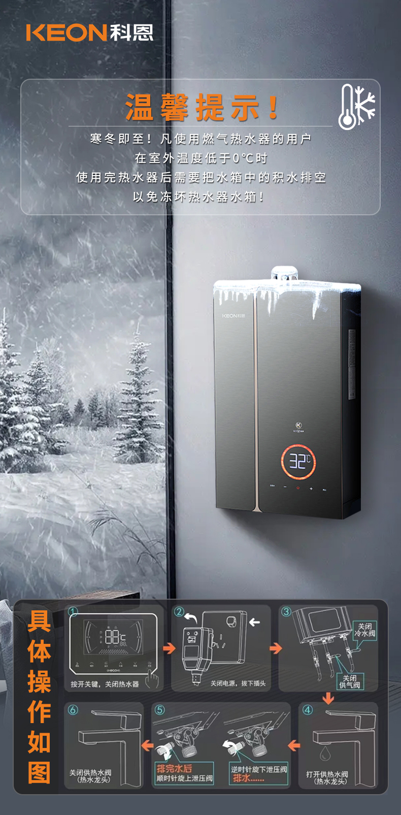 ②若熱水器凍住,請(qǐng)及時(shí)關(guān)閉燃?xì)忾y門與熱水器進(jìn)水閥門,并盡快進(jìn)行維修!