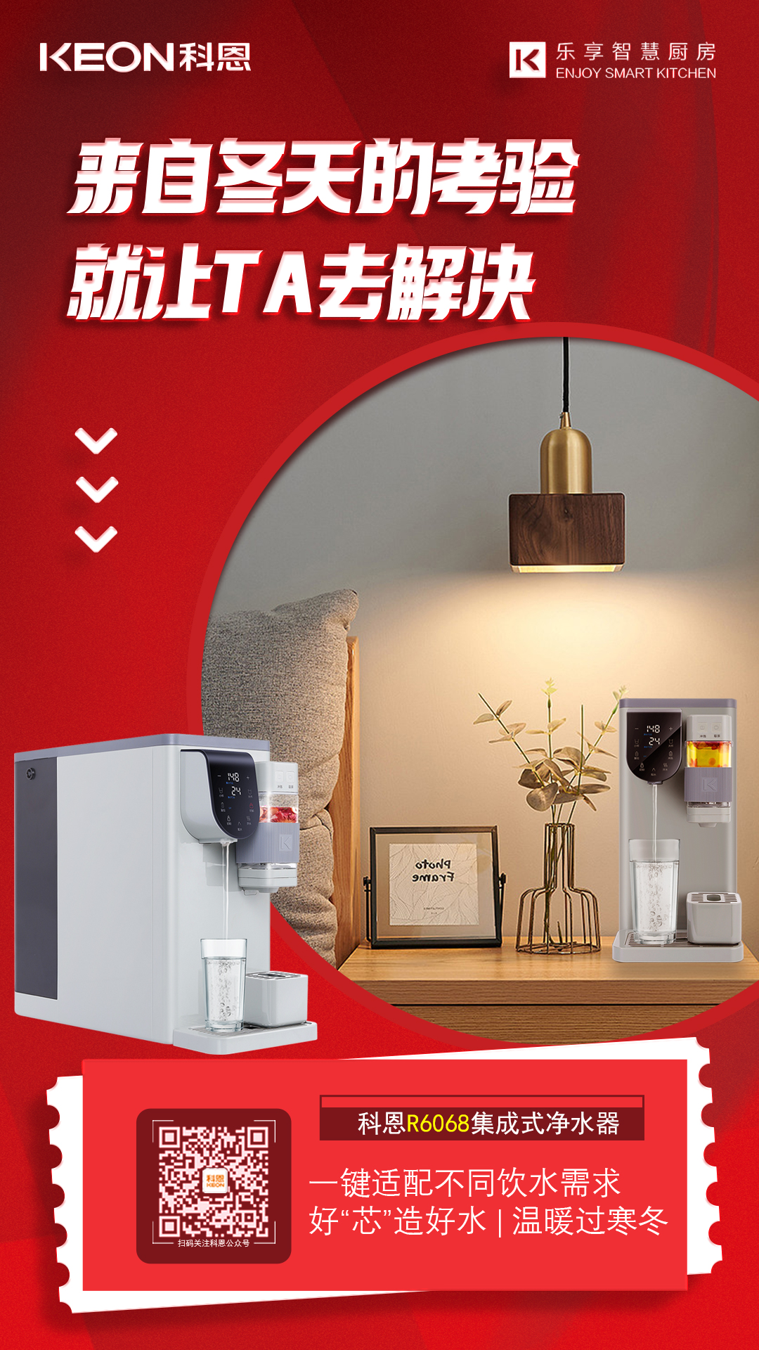 科恩集成式凈水器,RO精濾,UV殺菌,集凈飲加熱于一體,采用即熱和智能溫控技術,實現快速制熱,無極控溫,水量可調,滿足不同人群的用水需求,無論是老爸的一壺茶、親友的咖啡、果茶、寶寶的沖奶水,一應俱全,讓全家人在這個冬天隨時喝上安全健康水,暖胃更暖心。