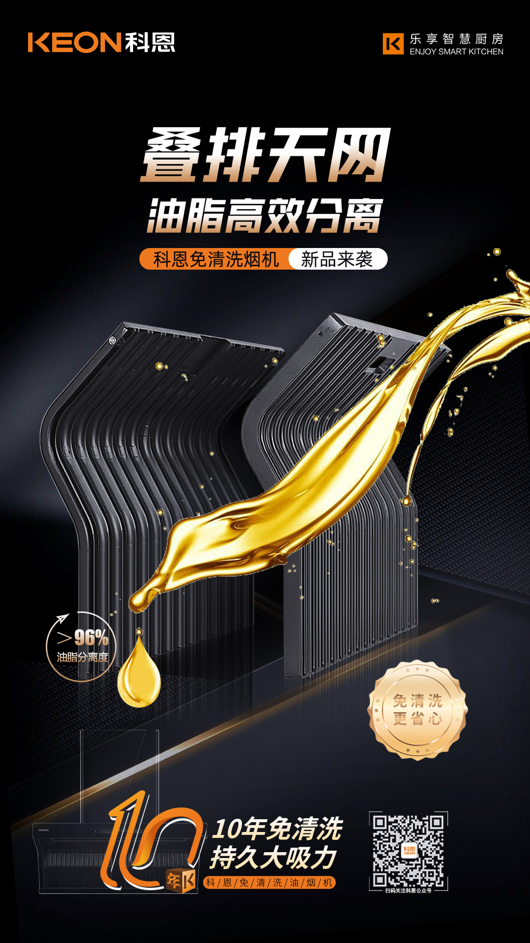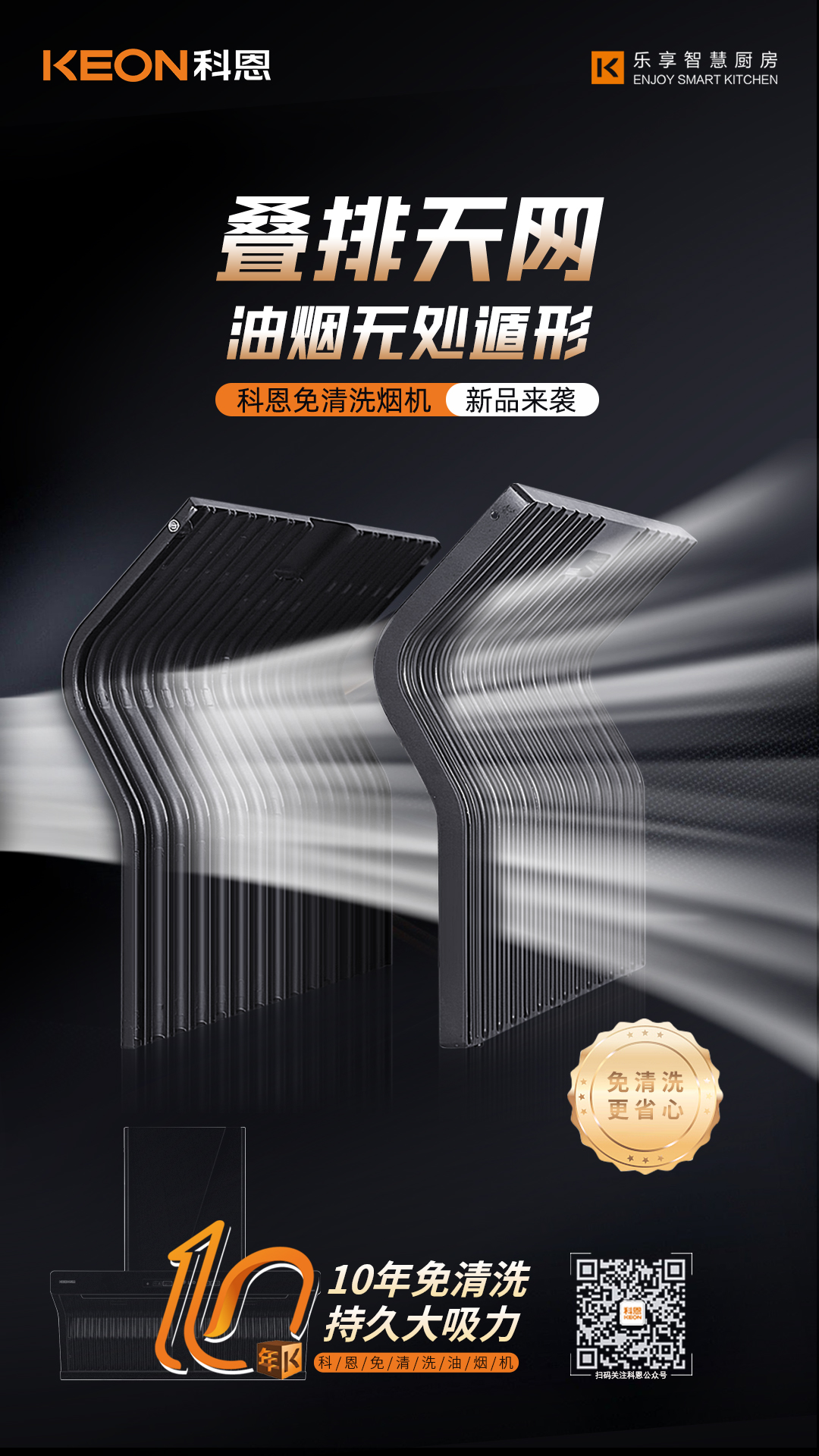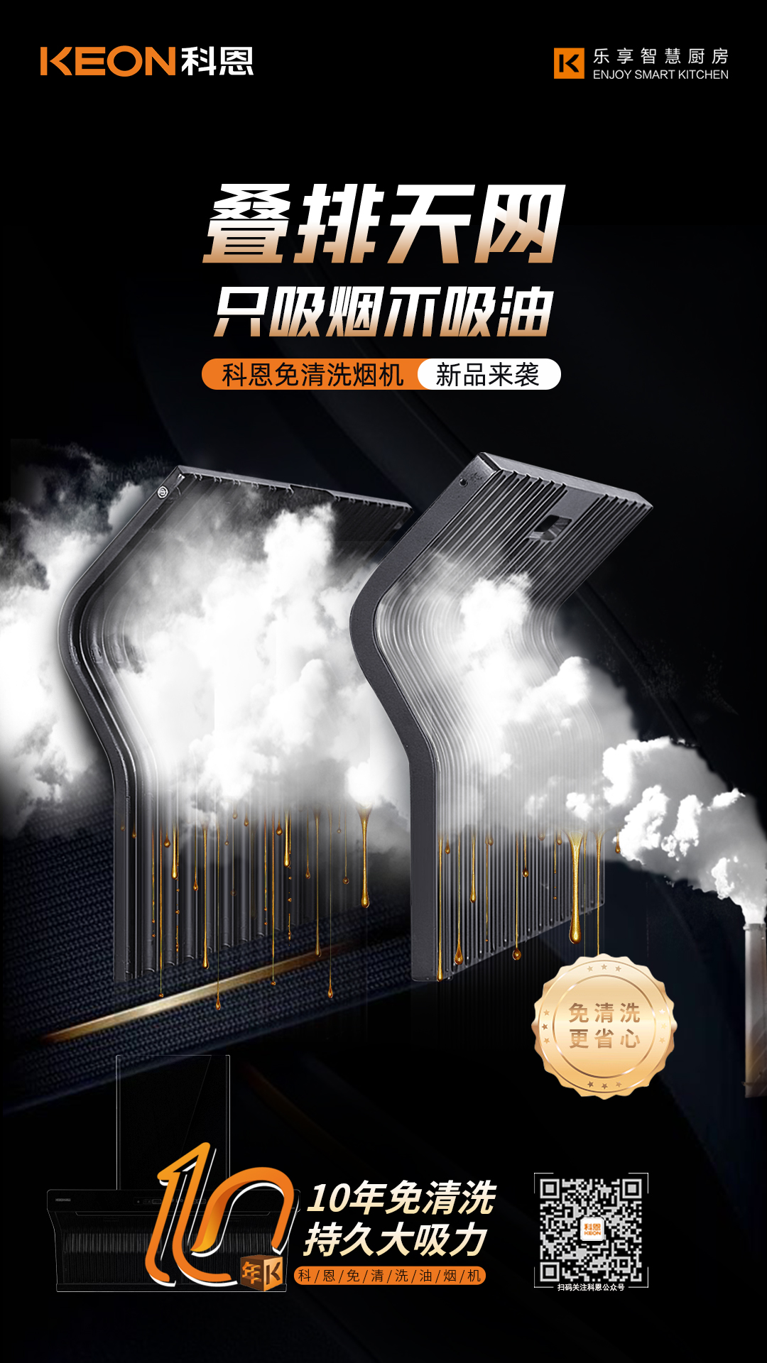 科恩電器歷時3年研發雙效疊排天網,采用易潔太空壓鑄鋁材,經過酸洗-噴砂工藝加之特氟龍噴涂最后高溫燒結,不僅不沾油、易清潔更好打理。同時,能好的阻燃阻熱!雙效疊排天網將油煙盡數隔離在外,真正做到只吸煙不吸油。徹底告別煙機清洗難題。十年免拆清洗,持久大吸力!終于一款替代人類清洗煙機的廚電產品即將面世,讓廚房生活不再油污滿地。