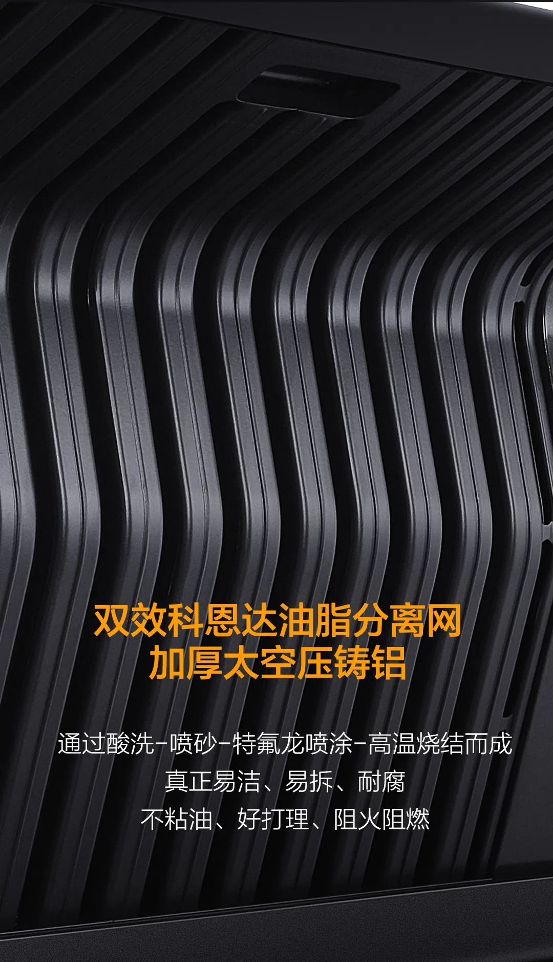在工藝上經過酸洗-噴砂工藝加之特氟龍噴涂最后高溫燒結,不僅不沾油、易清潔好打理。在分離油煙的同時,還能阻燃阻熱!保障廚房安全!