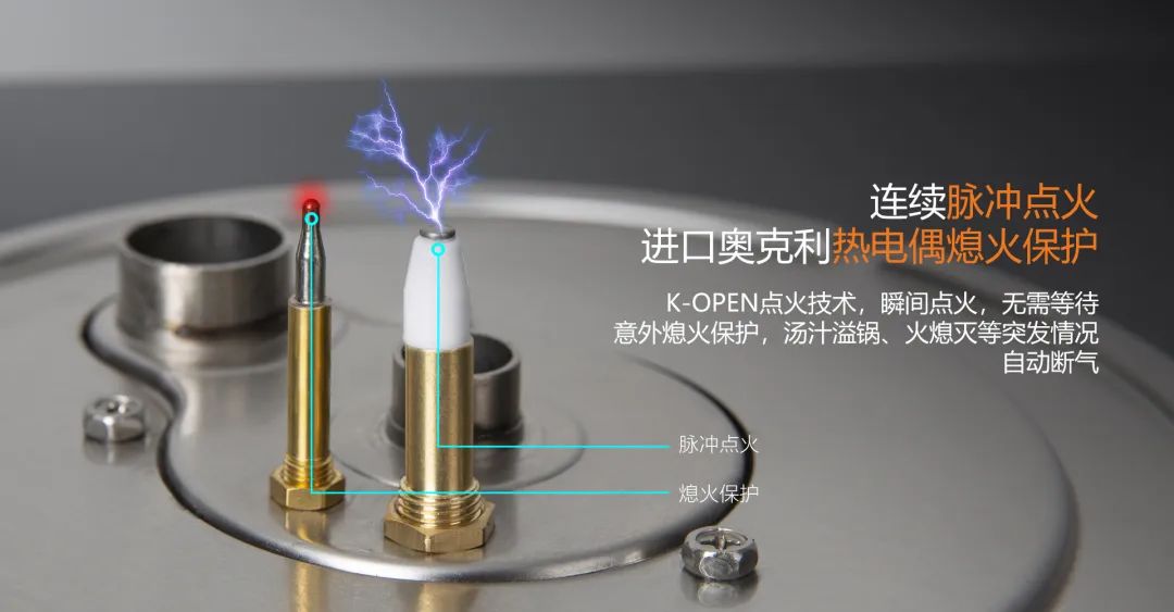 奧克利熄火針,意外熄火保護(hù),湯汁溢鍋、火熄滅等自動(dòng)斷氣,保障廚房安全。連續(xù)脈沖點(diǎn)火,瞬間點(diǎn)火,無需等待。