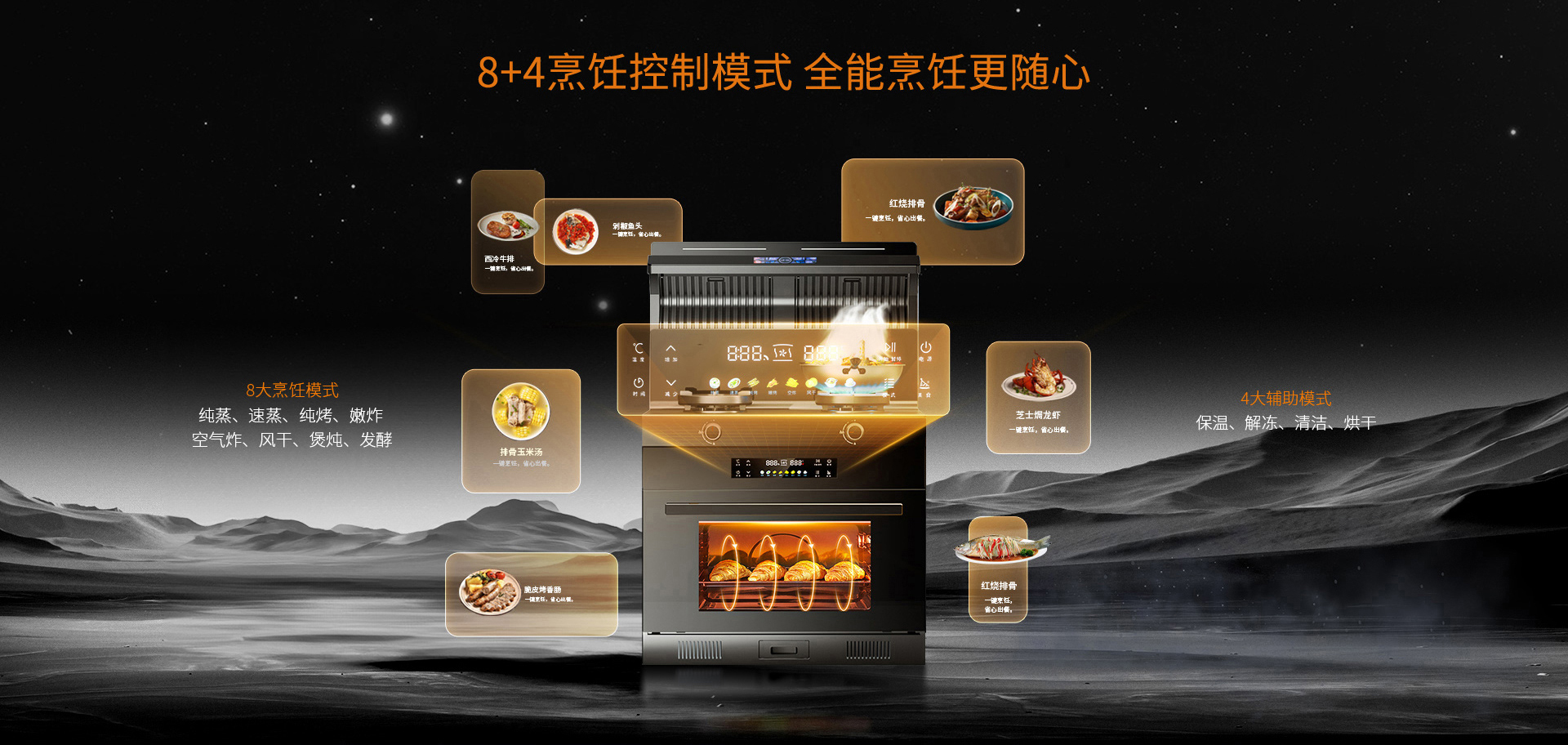 防爆免清洗集成灶標配8+4烹飪模式,可滿足純蒸、速蒸、純烤、嫩炸、空氣炸、風干、煲燉、發酵等8大烹飪模式,滿足日常烹飪需求,同時配置4大輔助模式,可實現保溫、解凍、清潔、烘干。