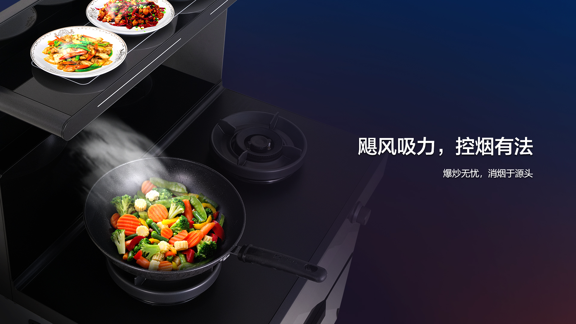 爆炒隨之而來的就是油煙問題,Q1黃金吸煙角搭配颶風大吸力,完美解決廚房油煙難題。