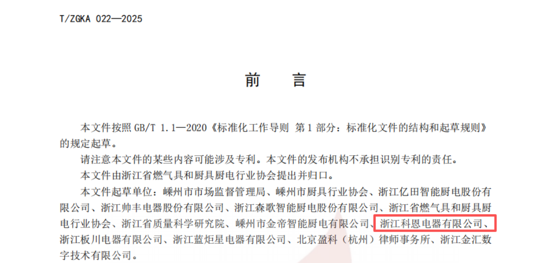 此次榮膺團標起草單位,是科恩十余載載譽前行的又一高光時刻。在榮譽殿堂中,高新技術企業認定與CNAS認可實驗室彰顯其科研實力;行業標準起草單位、集成灶團體標準起草單位、集成水槽標準參編單位等頭銜,“廚電行業十大品牌”“守合同重信用企業”等榮譽,印證其在標準制定領域的持續深耕,體現市場與社會的雙重認可。同時,作為中國五金協會、浙江省燃氣具和廚具廚電行業協會理事單位,科恩始終積極參與行業治理,用實際行動踐行領軍企業的責任擔當。