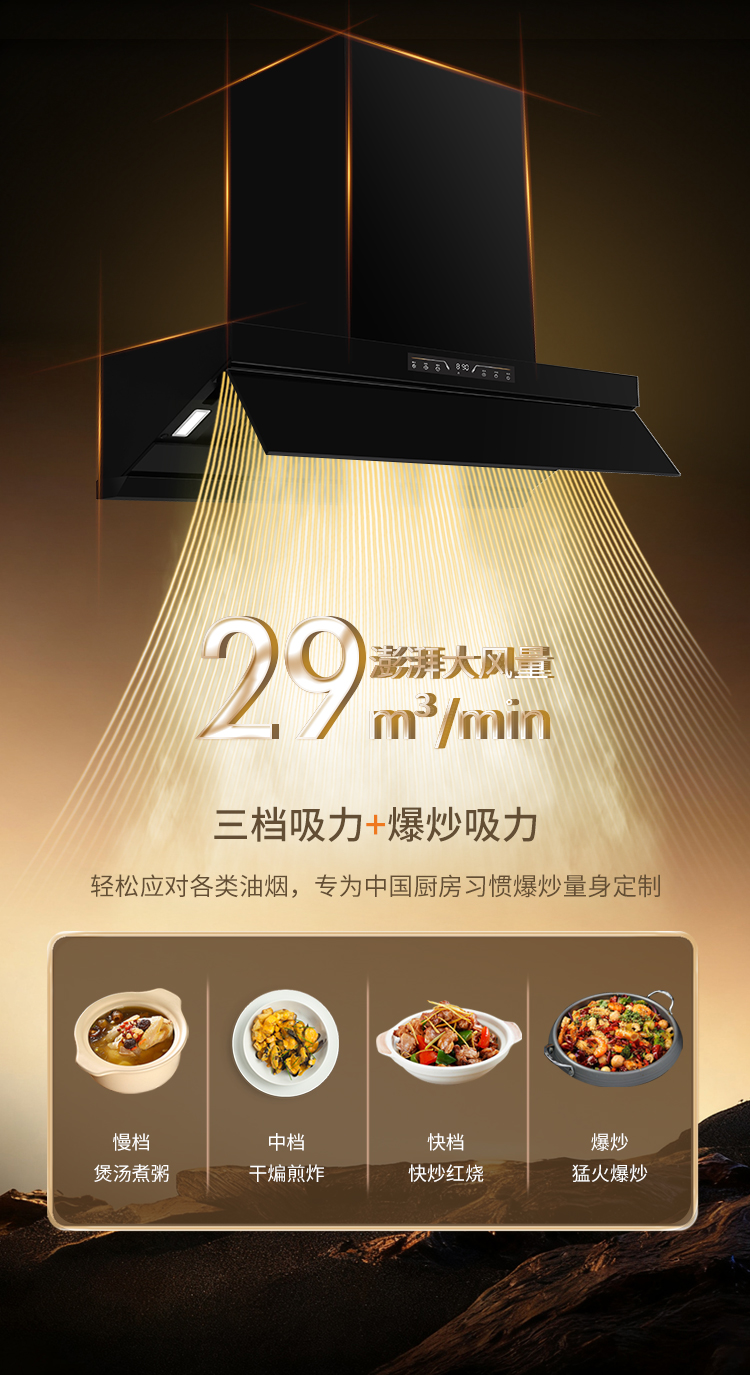 勁風(fēng)攬煙,凈無痕跡。想爆炒香椿的鮮香,慢燉春筍的清甜?29m³/min澎湃大吸力,濃煙剛起即吸,1200Pa超強(qiáng)靜壓,突破煙道擁堵,直流變頻電機(jī)遇強(qiáng)則強(qiáng),烹飪?nèi)炭諝馇逅鎰e油膩侵?jǐn)_。