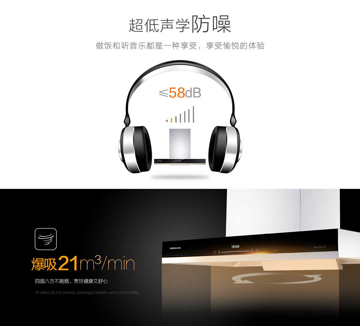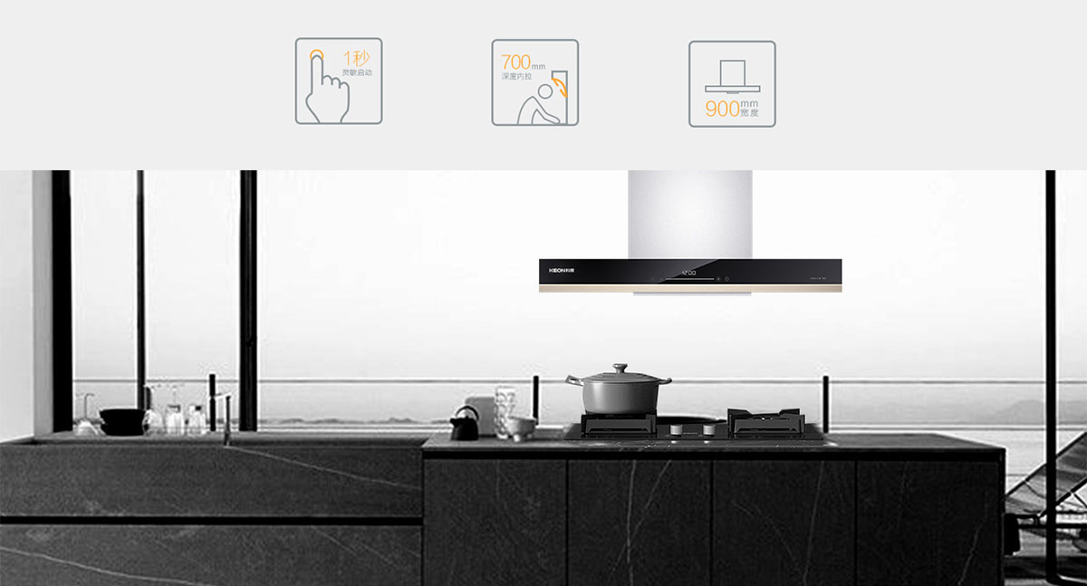 • 全腔900MM攏煙區,比普通煙腔更寬更深,有效鎖住油煙不外溢。