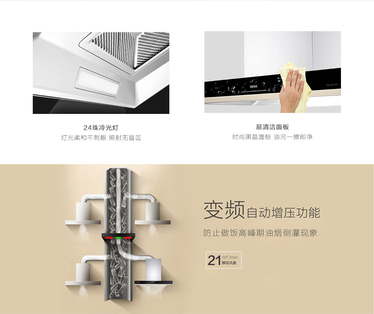 • 變頻自動增壓功能,防止做飯高峰期油煙倒灌現象。