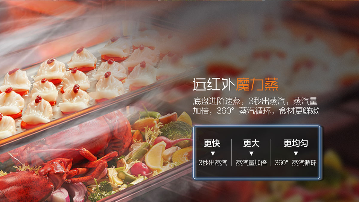 - 大容量蒸烤箱,120℃高溫快蒸,360〫立體炙烤