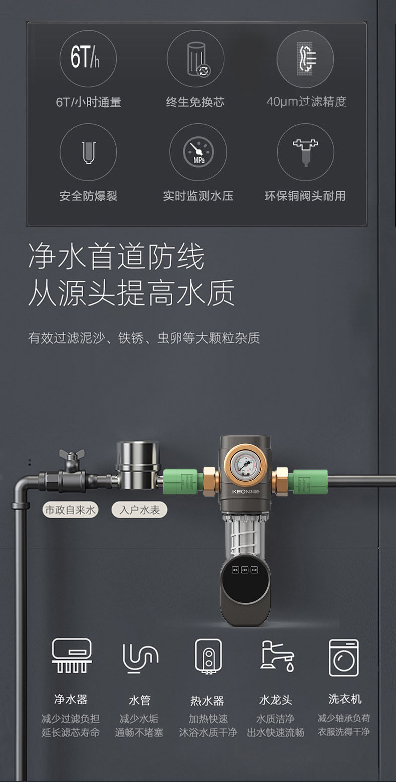 - 6噸/小時大流量,快速過濾,用水無壓力