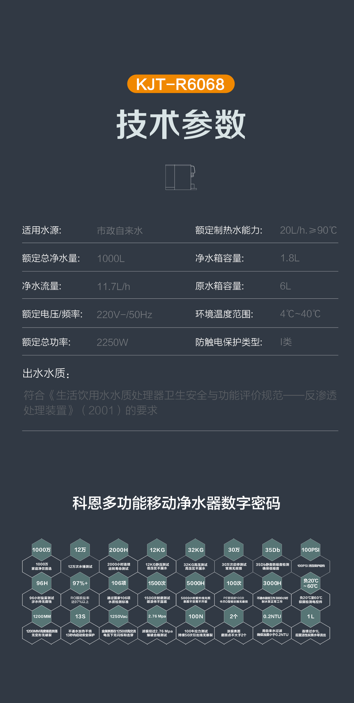 出水水質:符合《生活飲用水水質處理器衛生安全與功能評價規范--反滲透處理裝置》(2001)的要求。