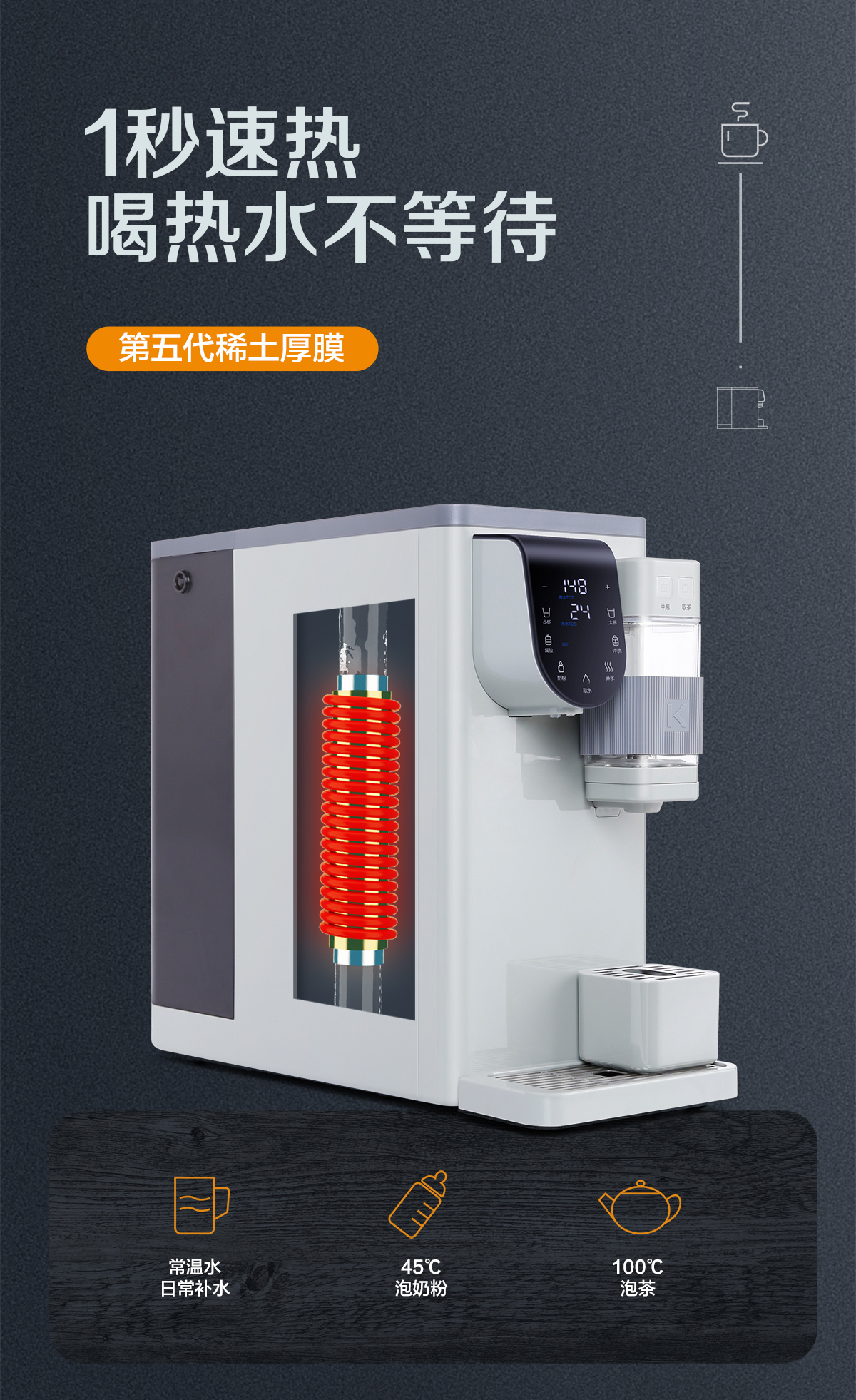 • 無極控溫控量,1秒速熱,飲水水溫水量隨心所控